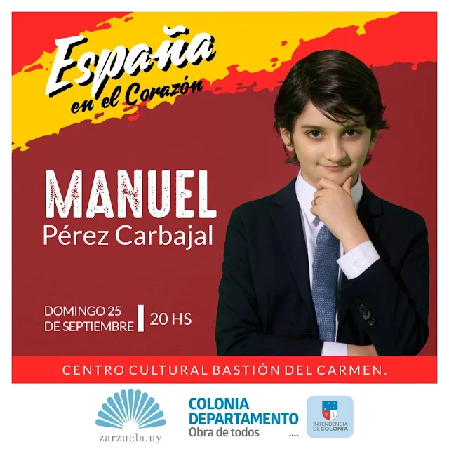 La Intendencia de Colonia, informa que en el marco del "Proyecto Zarzuela - Colonia 2022", se presentará en el Centro Cultural Bastión del Carmen, el próximo domingo 25 de setiembre a las 29:00 horas, el joven Manuel Pérez Carbajal.