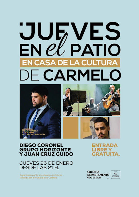 Diferentes estilos este “Jueves en el patio” en la Casa de la Cultura de Carmelo Con la organización de la Intendencia de Colonia, a través de la Dirección de Cultura, en la continuidad del ciclo Jueves en el Patio, en la Casa de la Cultura “Cnel. Ignacio Barrios” de Carmelo, es turno para disfrutar una noche de diferentes estilos de propuestas musicales. La presentación de Diego Coronel, ganador de la primera edición de Got Talent Uruguay, quien ofrecerá un repertorio que incluye temas liricos, tangos, mariachis y populares, entre otros.