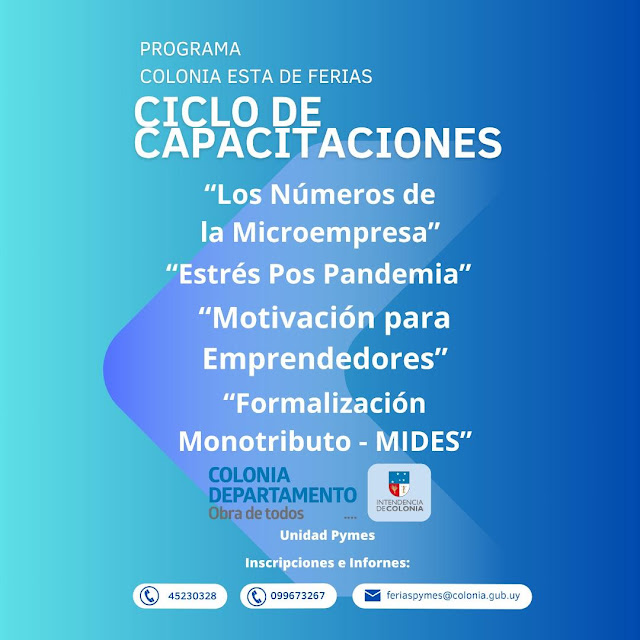 Ciclo de capacitaciones para emprendedores, octubre La Intendencia de Colonia a través de la Unidad Pymes y su Programa Colonia Está de Ferias, continúa llevando adelante en distintas localidades un importante ciclo de capacitaciones, del cual pueden participar todos los emprendedores que lo deseen y se destaca que la propuesta es gratuita con inscripción previa.