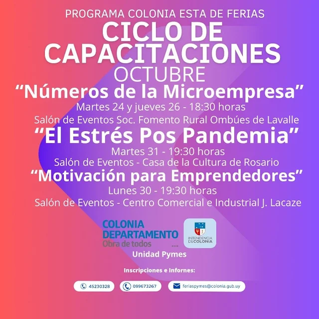 La Intendencia de Colonia a través de la Unidad Pymes y su Programa Colonia Está de Ferias, continúa llevando adelante en distintas localidades un importante ciclo de capacitaciones, del cual pueden participar todos los emprendedores que lo deseen y se destaca que la propuesta es gratuita con inscripción previa.